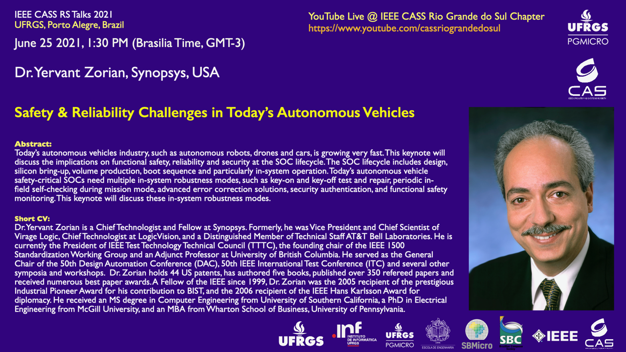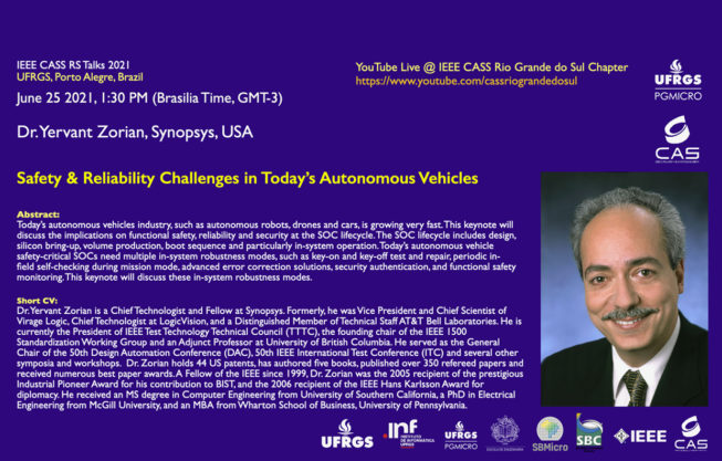 Na próxima sexta-feira, dia 25/06 às 13h30min (Horário de Brasília) ocorrerá a palestra “Safety & Reliability Challenges in Today’s Autonomous Vehicles” com o Dr. Yervant Zorian (Synopsys, USA).