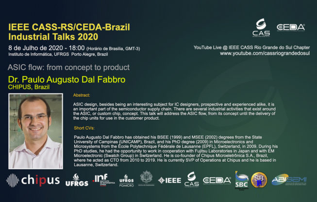 Nesta quarta-feira, dia 08/07 às 18h (Horário de Brasília) ocorrerá a palestra “ASIC flow: from concept to product”, com o Dr. Paulo Augusto Dal Fabbro (CHIPUS, Brazil). A transmissão será feita pelo canal do YouTube do IEEE CASS Rio Grande do Sul Chapter.