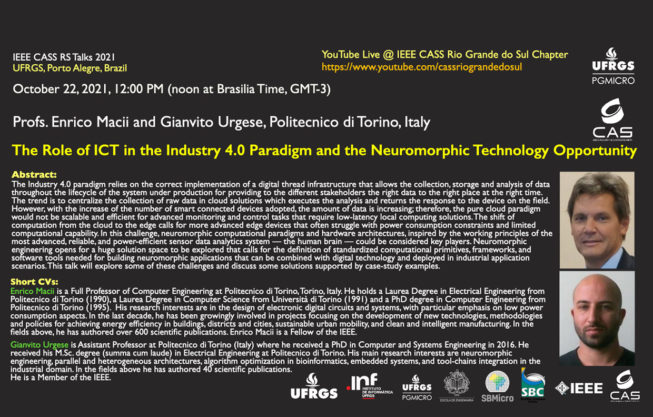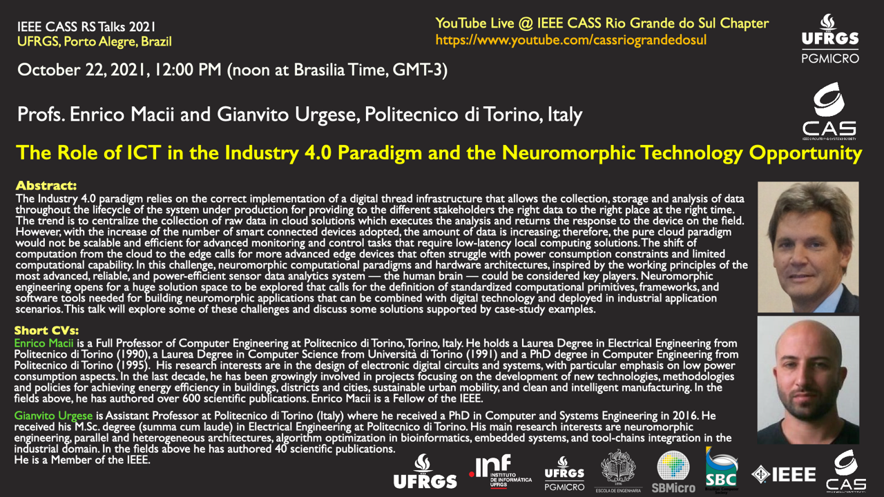No dia 15/10 às 13h30min (Horário de Brasília) ocorrerá a palestra “The Role of ICT in the Industry 4.0 Paradigm and the Neuromorphic Technology Opportunity” com os Profs. Enrico Macii e Gianvito Urgese (Politecnico di Torino, Italy ).