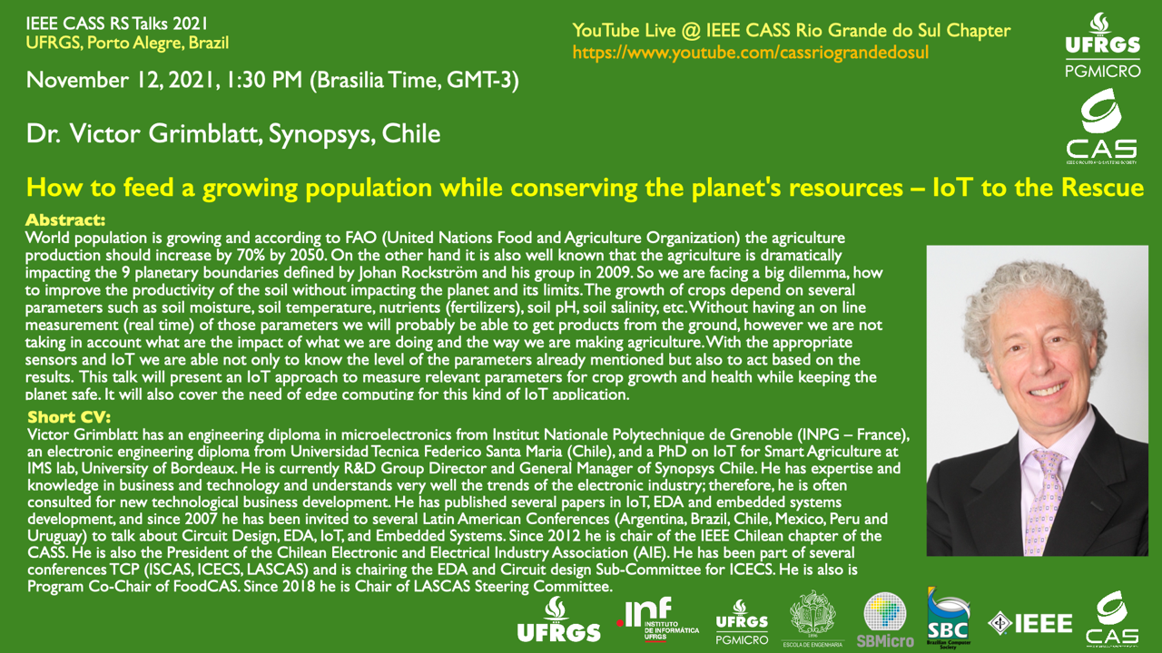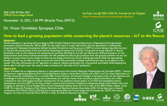 No dia 12/11 às 13h30min (Horário de Brasília) ocorrerá a palestra “How to feed a growing population while conserving the planet’s resources – IoT to the Rescue” com o Dr. Victor Grimblatt (Synopsys, Chile).