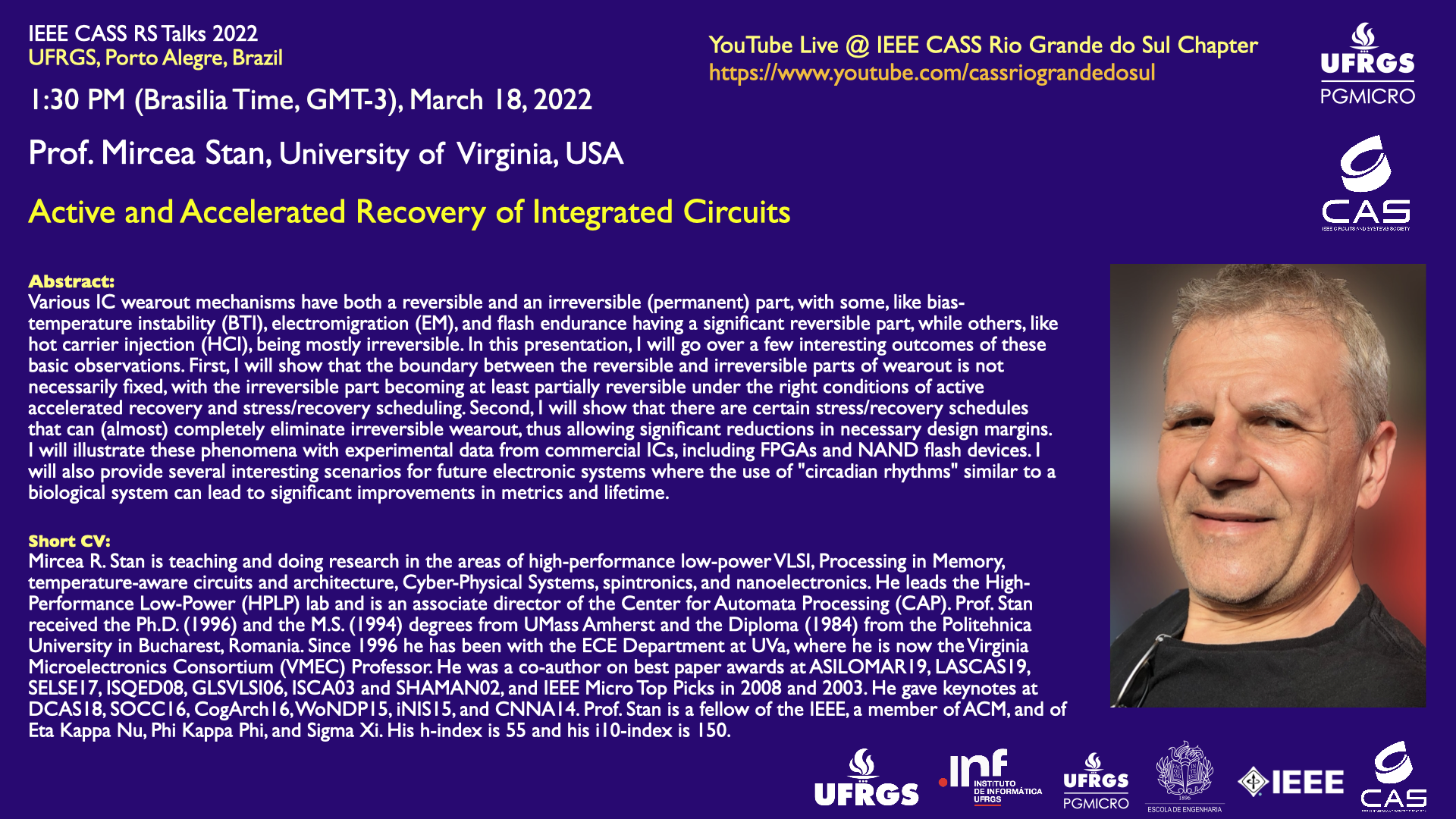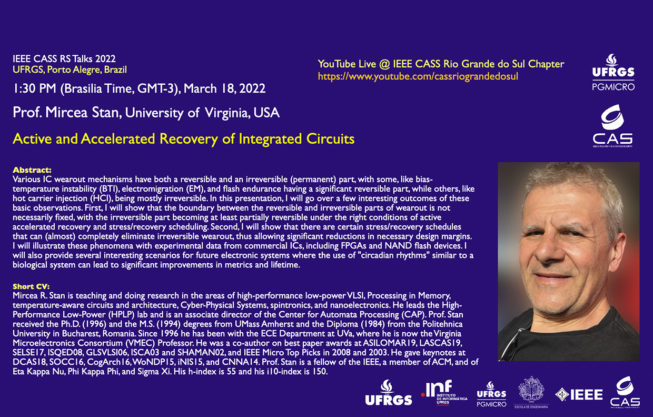 No dia 18/03 às 13h30min (Horário de Brasília) ocorrerá a palestra “Active and Accelerated Recovery of Integrated Circuits” com o Prof. Mircea Stan (University of Virginia, USA ).