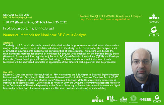 No dia 25/03 às 13h30min (Horário de Brasília) ocorrerá a palestra “Numerical Methods for Nonlinear RF Circuit Analysis” com o Prof. Eduardo Gonçalves de Lima (UFPR, Brazil ).