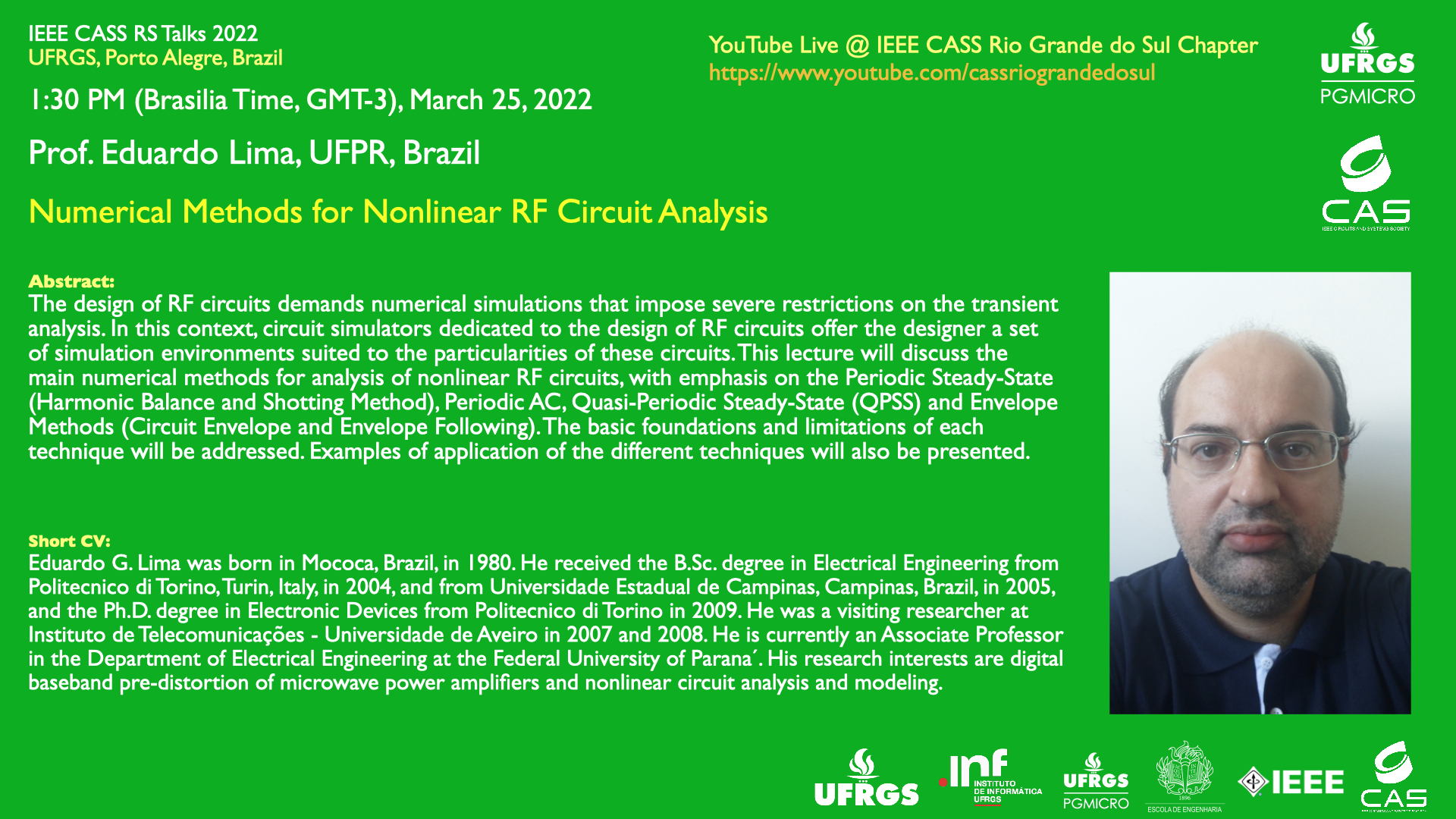 A transmissão será feita pelo canal do YouTube do IEEE CASS Rio Grande do Sul Chapter.