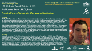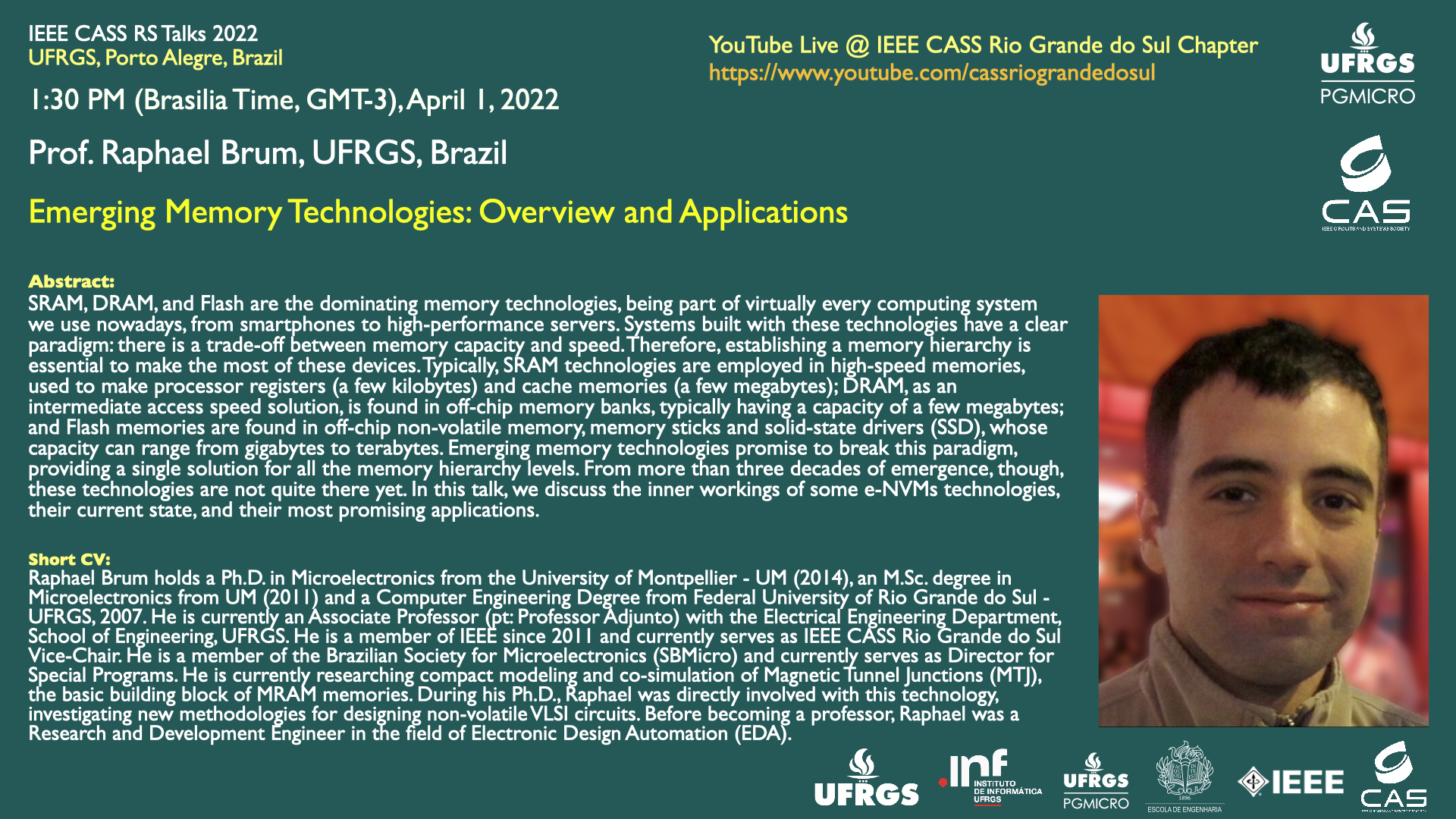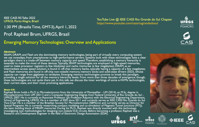 No dia 01/04 às 13h30min (Horário de Brasília) ocorrerá a palestra “Emerging Memory Technologies: Overview and Applications” com o Prof. Raphael Brum (UFRGS, Brasil).