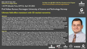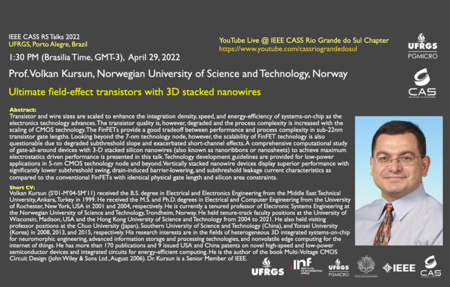 No dia 29/04 às 13h30min (Horário de Brasília) ocorrerá a palestra “Ultimate Field-Effect Transistors with 3D Stacked Nanowire” com o Prof. Volkan Kursun (Norwegian University of Science and Technology, Norway).