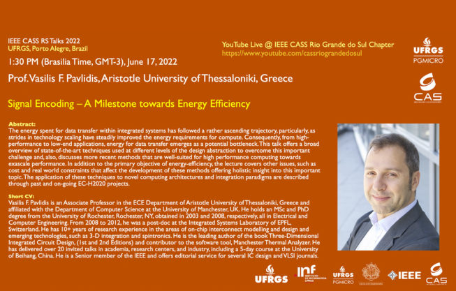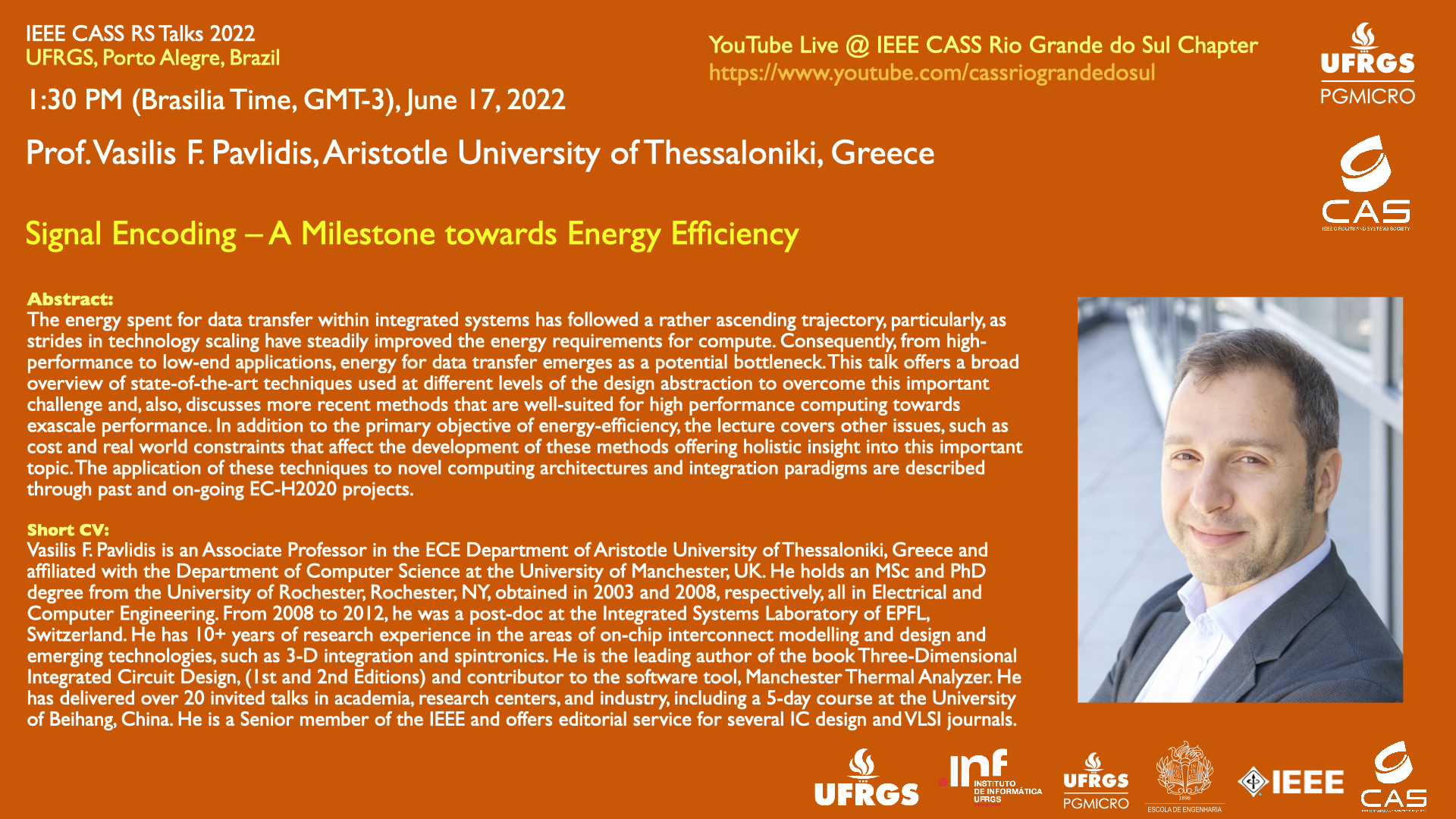 No dia 17/06 às 13h30min (Horário de Brasília) ocorrerá a palestra “Signal Encoding – A Milestone Towards Energy Efficiency” com o Prof. Vasilis F. Pavlidis (Aristotle University of Thessaloniki, Greece).