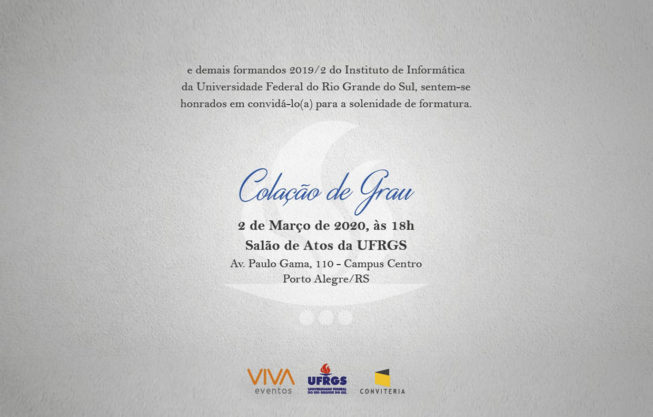 Acontecerá hoje a partir das 18h no Salão de Atos da UFRGS a Solenidade de Colação de Grau dos formandos 2019/2 do Instituto de Informática. Confira a lista dos formandos: