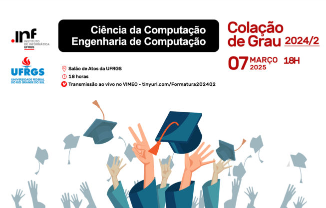 O Instituto de Informática da UFRGS celebra a conquista de seus estudantes com a realização das cerimônias de formatura dos cursos de Ciência da Computação (CIC) e Engenharia da Computação (ECP). A formatura de gabinete ocorreu no dia 25 de fevereiro e diplomou 22 alunos. Já a cerimônia solene acontecerá nesta sexta-feira, 7 de março, às 18h, no Salão de Atos da UFRGS.