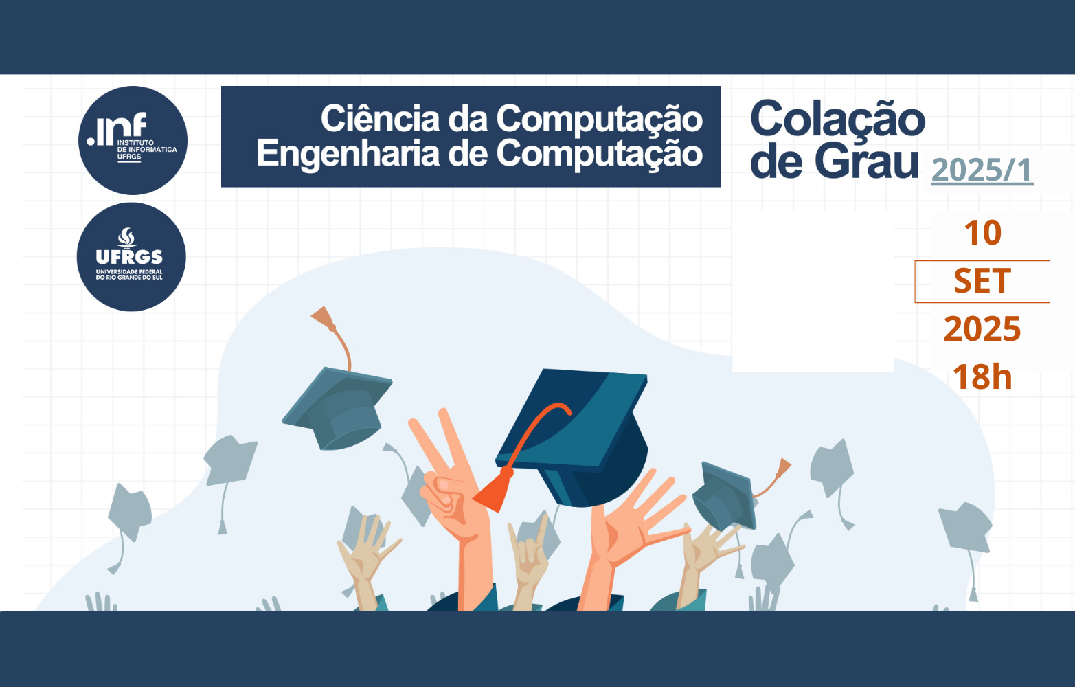 O Instituto de Informática da UFRGS celebra a conquista de seus estudantes com a realização das cerimônias de formatura dos cursos de Ciência da Computação (CIC) e Engenharia da Computação (ECP). A formatura de gabinete ocorreu no dia 19 de agosto e a cerimônia solene acontecerá nesta quarta-feira, 10 de setembro, às 18h, no Salão de Atos da UFRGS.
