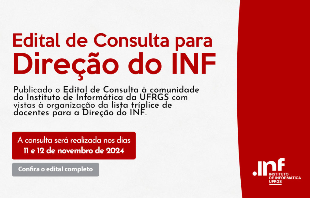 É divulgado o edital que estabelece as diretrizes para o processo de consulta à comunidade do Instituto de Informática (INF) com vistas à formação das listas tríplices de docentes candidatos aos cargos de Diretor(a) e Vice-Diretor(a). A consulta ocorrerá nos dias 11 e 12 de novembro de 2024.