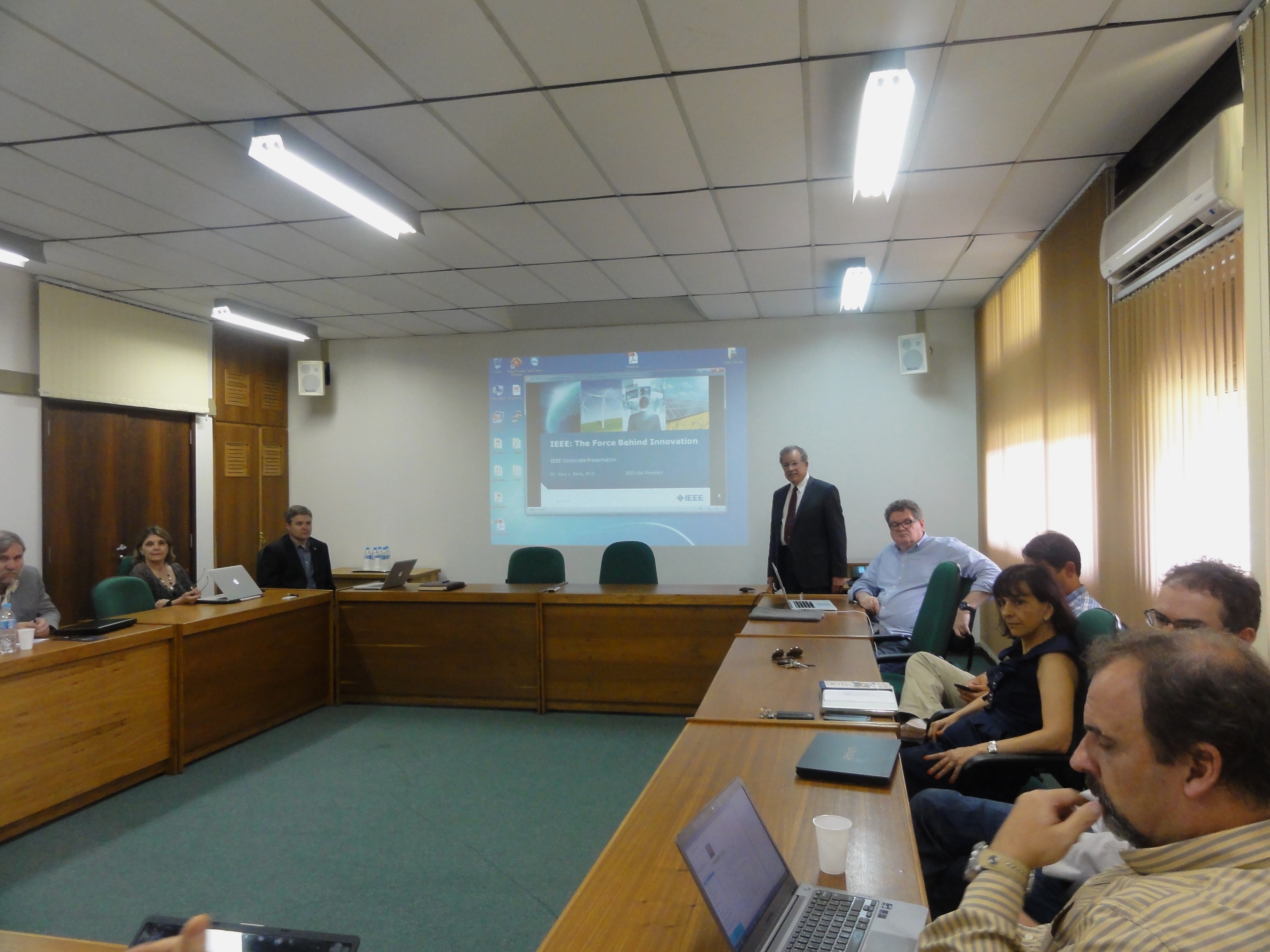 A comitiva do IEEE visita o Brasil por ocasião da posse de Roberto Boisson de Marca como Presidente dessa prestigiosa sociedade. É formada pelo Diretor & Presidente do IEEE-USA, Dr. Gary L. Blank; Diretora & Delegada da Região 3, Sra. Mary Ellen Randall; Diretor & Delegado da Divisão VI, Prof. Bogdan M. Wilamowski; Diretora & Delegada da Divisão V (IEEE Computer Society), Susan Land (também ex-presidente da IEEE Computer Society) e Eugenio Loureiro, Secretário da IEEE Brasil. Foram feitas apresentações do Instituto (prof. Lamb), da Escola de Engenharia (prof. Carlos Eduardo Pereira), do Parque Tecnológico da UFRGS e do CEI (profa. Ingrid Pôrto), além de apresentações dos programas de pós-graduação do INF e da Engenharia relacionados ao IEEE.