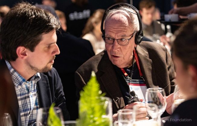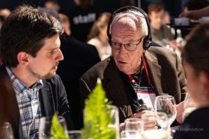Jorge Wagner em jantar com o Prof. Ivan Sutherland (Turing Award 1988), que, em 1968, apresentou o primeiro head-mounted display de Realidade Virtual, área em que Jorge trabalha atualmente. (Foto: Heidelberg Laureate Forum Foundation)