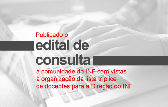 A comunidade do Instituto de Informática será consultada para subsidiar o Conselho do Instituto de Informática (CONINF) na organização das listas tríplices de docentes que exercerão a Direção do INF a partir de 21/12/2020. O edital completo pode ser acessado aqui.