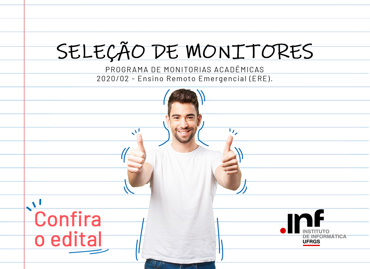 O Instituto de Informática da UFRGS torna público à comunidade acadêmica o Edital de Seleção de Monitores para disciplinas do Departamento de Informática Aplicada e do Departamento de Informática Teórica, referente às atividades que serão desenvolvidas no semestre 2020/02 – Ensino Remoto Emergencial (ERE).