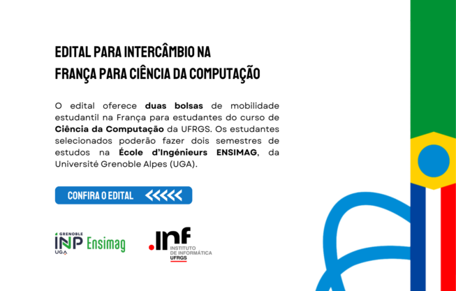 O Instituto de Informática da UFRGS anuncia a abertura das inscrições para o Edital 2025 de mobilidade estudantil na École d’Ingénieurs ENSIMAG, da Université Grenoble Alpes (UGA), na França. A iniciativa é voltada para estudantes do curso de Bacharelado em Ciência da Computação e oferece uma experiência acadêmica internacional com reconhecimento de créditos na UFRGS.