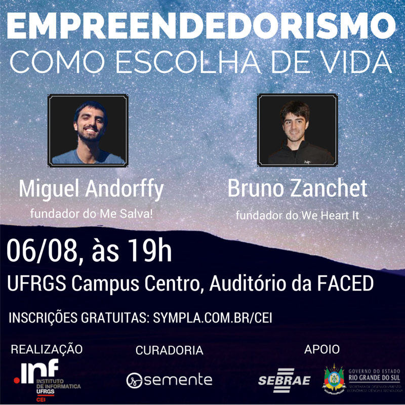 O Centro de Empreendimentos em Informática – CEI-INF/UFRGS está promovendo a palestra“Empreendedorismo como escolha de vida”, que será ministrada por Miguel Andorffy e Bruno Zanchet. O evento acontecerá no dia 06 de agosto, às 19h, no auditório da Faculdade de Educação – FACED, Prédio 12201, Av. Paulo da Gama, Campus Centro. As inscrições são gratuitas e devem ser feitas no site:www.sympala.com.br/CEI