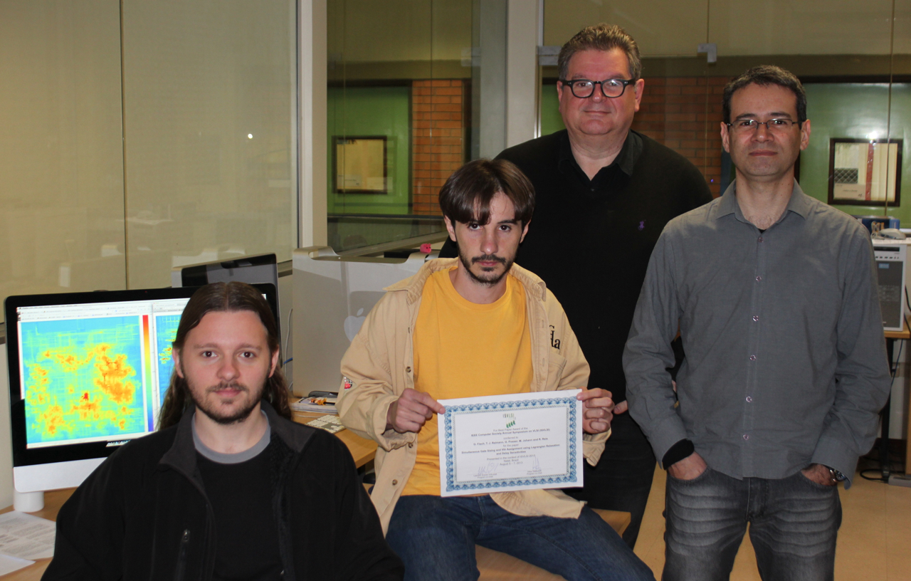 Equipe de alunos e professores do PGMicro e PPGC-INF, na área de EDA (Electronic Design Automation) ganhou o prêmio de melhor artigo (Best Paper Award) do IEEE ISVLSI 2013 – IEEE Computer Society Annual Symposium on VLSI, realizado em Natal, de 5 a 7 de Agosto. O artigo tem como co-autores os alunos de doutorado Guilherme Flach (PGMicro), Tiago Reimann (PGMicro), Gracieli Posser (PPGC – atualmente efetuando estágio na Universidade de Minnesota), e os professores Marcelo Johann e Ricardo Reis. O artigo premiado tem o título “Simultaneous Gate Sizing and Vth Assignment using Lagrangian Relaxation and Delay Sensitivities” e trata do dimensionamento automático de transistores associado à alocação de diferentes Vth (tensões de limiar dos transistores). O Comitê de Seleção do Prêmio considerou as avaliações efetuadas durante a seleção dos artigos e a qualidade da apresentação, que foi efetuada pelo Guilherme Flach. Cerca de 90 % dos trabalhos apresentados no evento foram provenientes de países de diversos continentes. No próximo ano o IEEE ISVLSI será realizado nos USA e em 2015 na França.