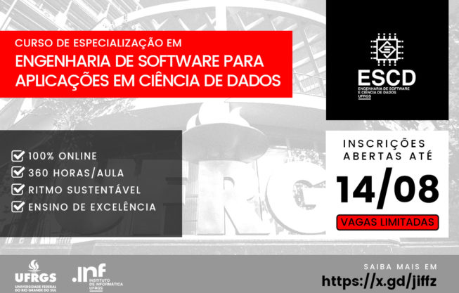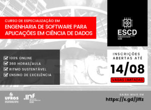 O Instituto de Informática (INF) abre inscrições para o curso de especialização em Engenharia de Software para Aplicações de Ciência de Dados, voltado para profissionais que desejam atender às crescentes demandas por soluções de software inovadoras. Com o objetivo de explorar dados e extrair insights com aplicações voltadas à tomada de decisões, essa especialização trata de forma sinérgica duas áreas tradicionalmente abordadas de forma isolada: Engenharia de Software e Ciência de Dados. O curso conta com a qualidade do corpo docente do INF, ao qual agrega profissionais do mercado para uma abordagem mais pragmática.
