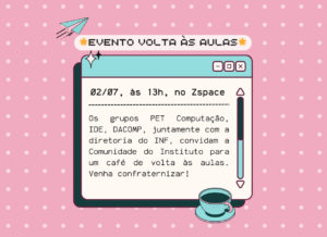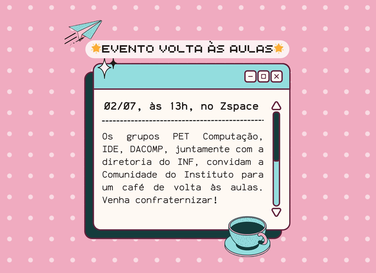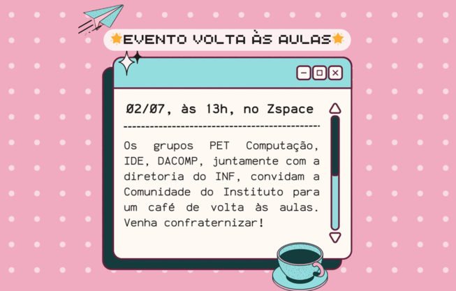 Os grupos PET Computação, IDE, DACOMP juntamente com a diretoria do Instituto de Informática convidam toda a Comunidade do INF para um café especial de boas-vindas!