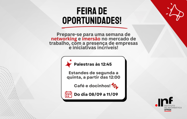 A Feira de Oportunidades terá palestras e estandes, de segunda a quinta, a partir das 12h no prédio 43413 do INF, no quais interessados poderão dialogar sobre oportunidades de mercado com representantes de 9 marcas que trarão para exposição as suas iniciativas.