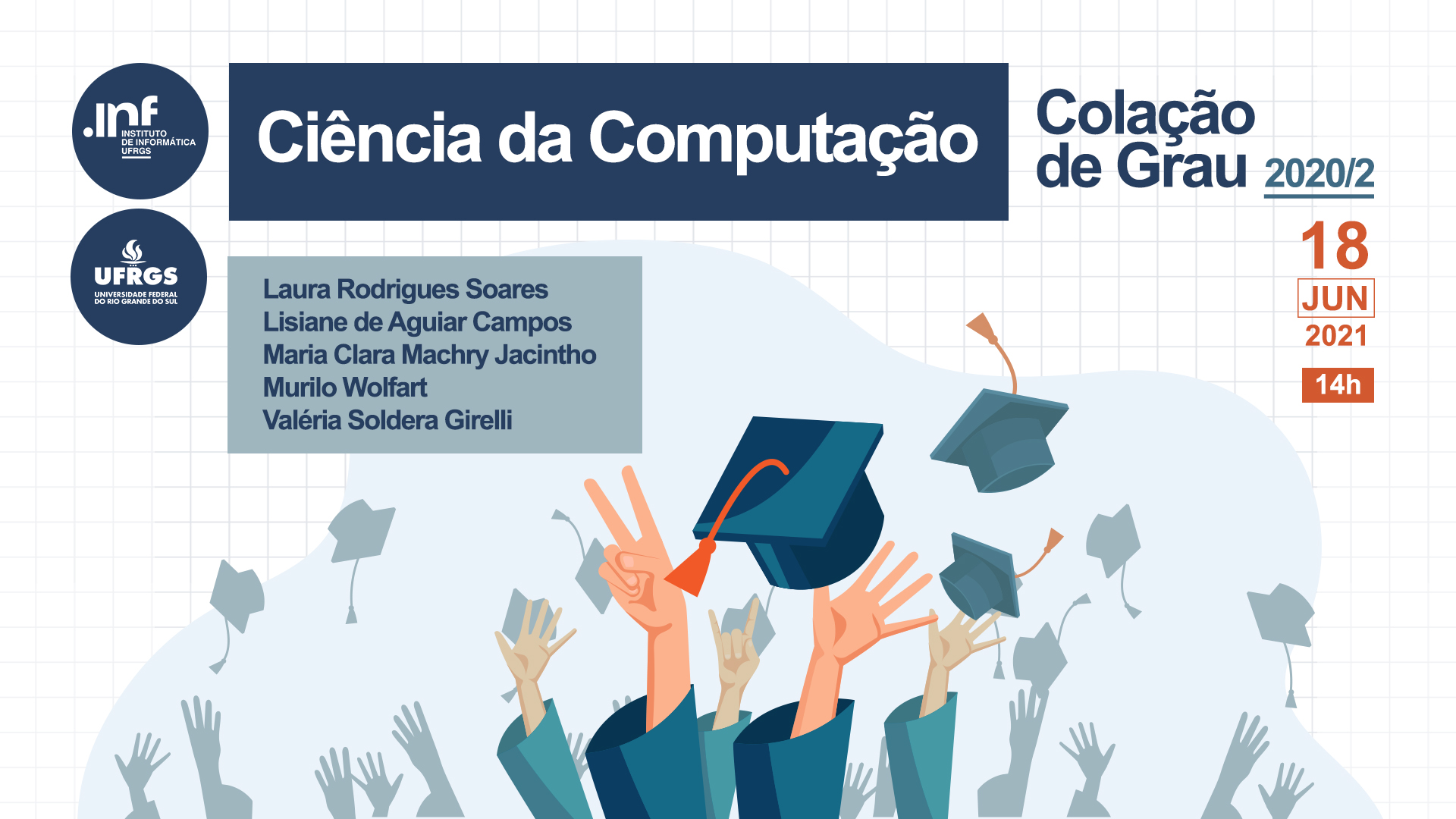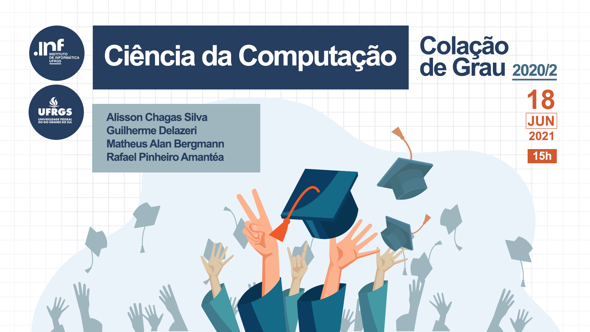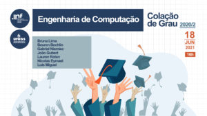 Completando o grupo de formandos e formandas da Ciência da Computação e da Engenharia de Computação do INF, neste dia 18 de junho de 2021, colam grau em gabinete 22 discentes. Esse é um momento para coroar a trajetória na graduação de cada aluno, marcando a passagem da condição de estudante para profissional.