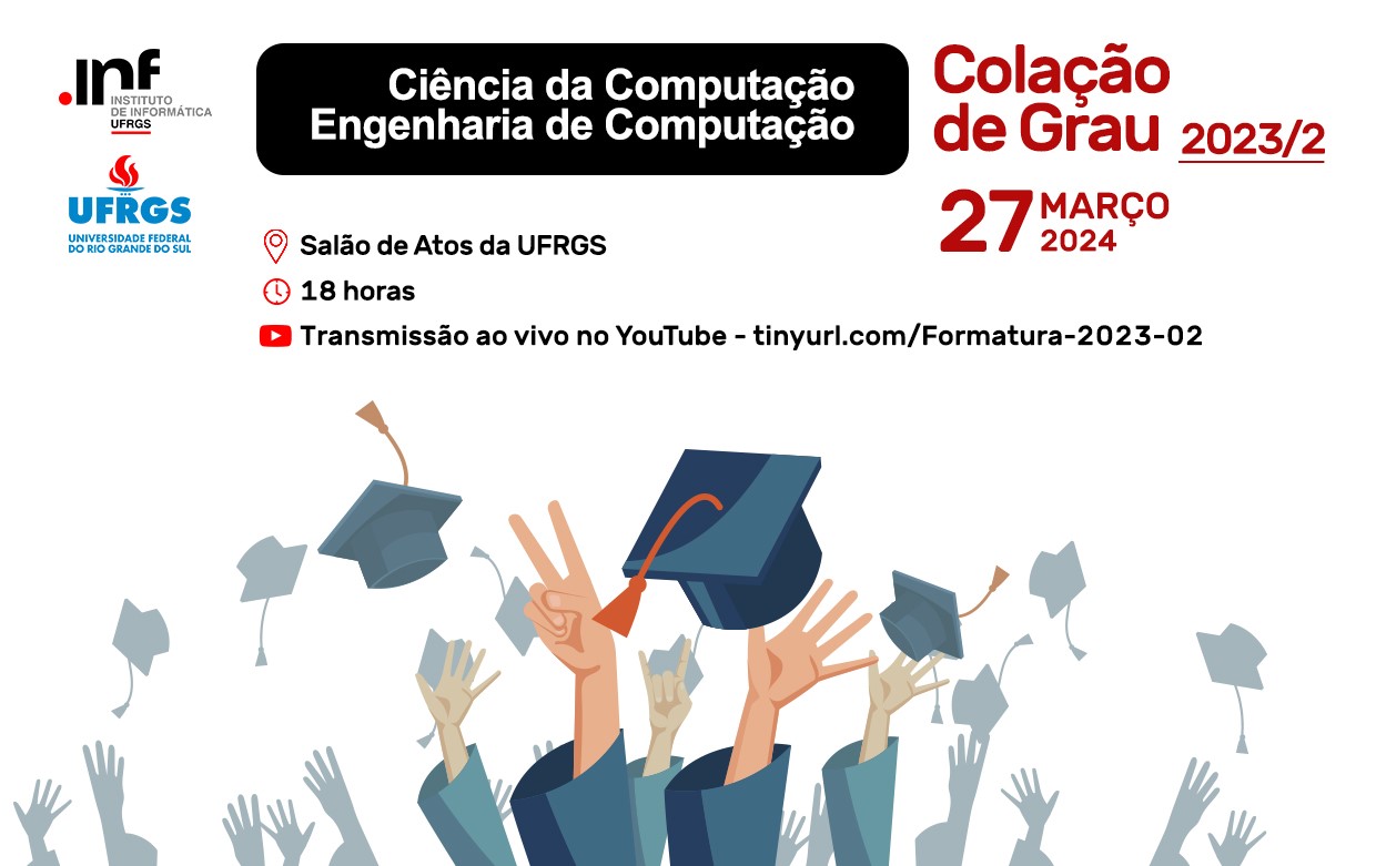 Nesta quarta-feira, 27/03/2024, às 18 horas, teremos a Sessão Solene de Colação de Grau do segundo semestre letivo do ano de 2023 do curso de Ciência da Computação, do Instituto de Informática, e do curso de Engenharia de Computação, que é compartilhado entre o Instituto de Informática e a Escola de Engenharia da UFRGS.