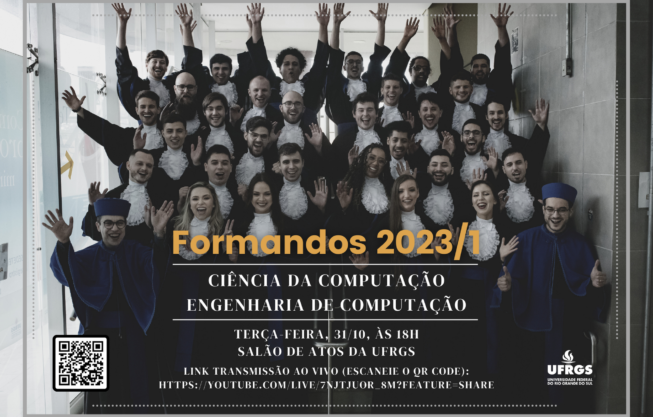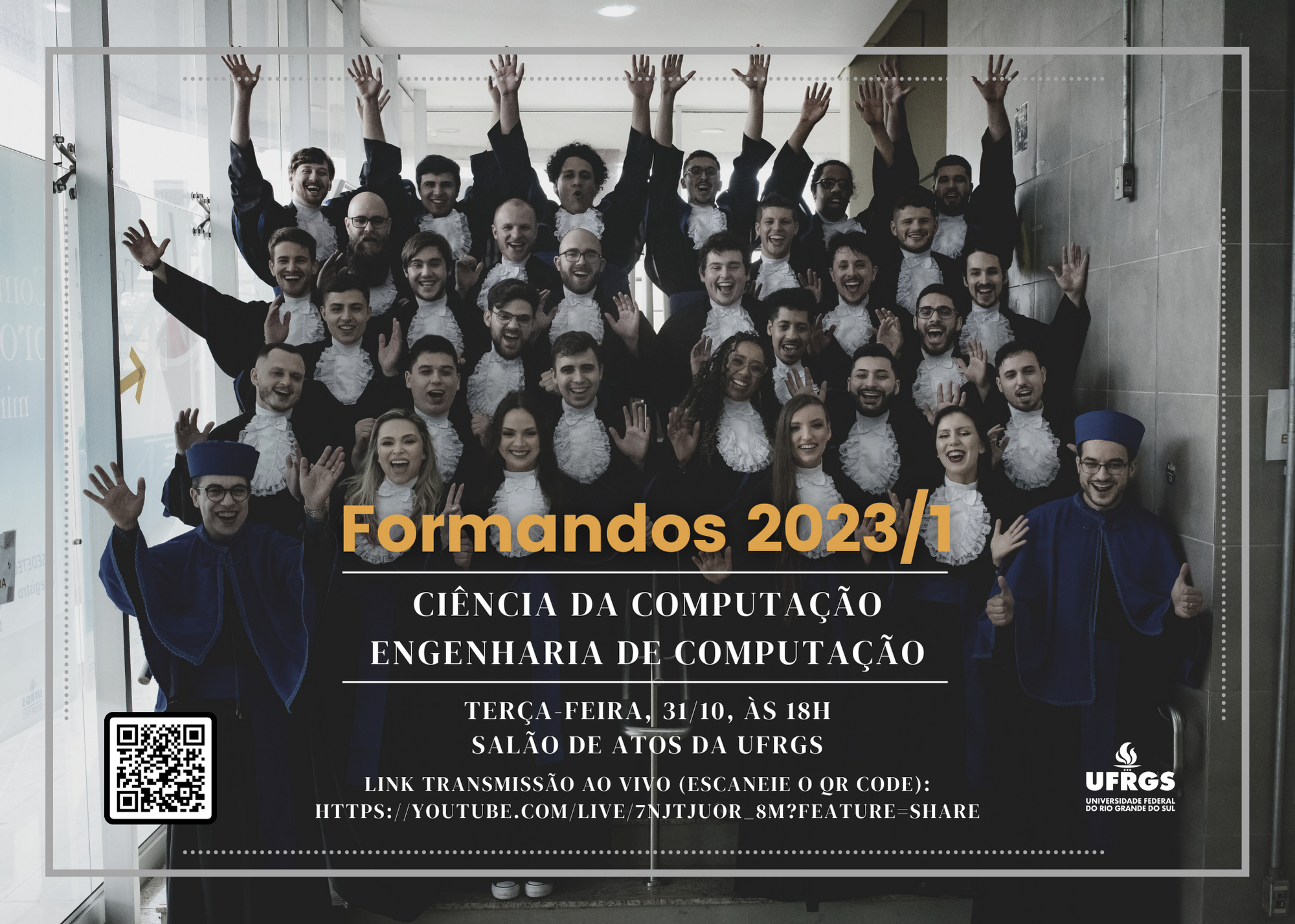 Nesta terça-feira, dia 31/10 às 18 horas, ocorrerá a Sessão Solene de Colação de Grau do primeiro semestre letivo do ano de 2023 do curso de Ciência da Computação, do Instituto de Informática, e do curso de Engenharia de Computação, que é compartilhado entre o Instituto de Informática e a Escola de Engenharia da UFRGS.