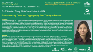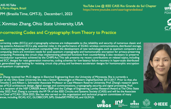 No dia 01/12 às 13h30 (Horário de Brasília) ocorrerá a palestra “Error-correcting Codes and Cryptography: from Theory to Practice” com a Prof. Xinmiao Zhang, professora na Ohio State University, USA (Universidade de Ohio – EUA)