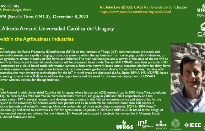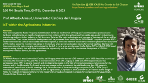 No dia 08/12 às 14h30 (Horário de Brasília) ocorrerá a palestra “IoT within the Agribusiness Industries” com a Prof. Alfredo Arnaud, professor na Universidad Católica del Uruguay (Universidade Católica do Uruguai)