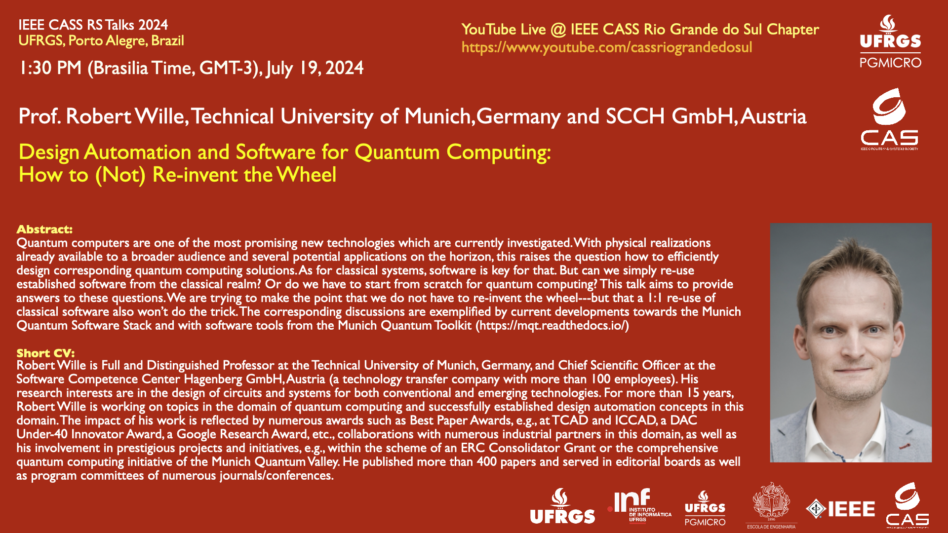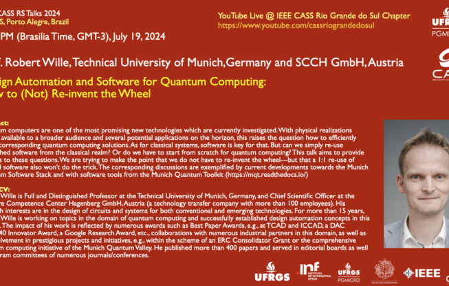No dia 19 de julho às 13:30h (Horário de Brasília) ocorrerá a palestra “Design Automation and Software for Quantum Computing: How to (Not) Re-invent the Whee” com Prof. Robert Wille, Technical University of Munich,Germany and SCCH GmbH, Austria.