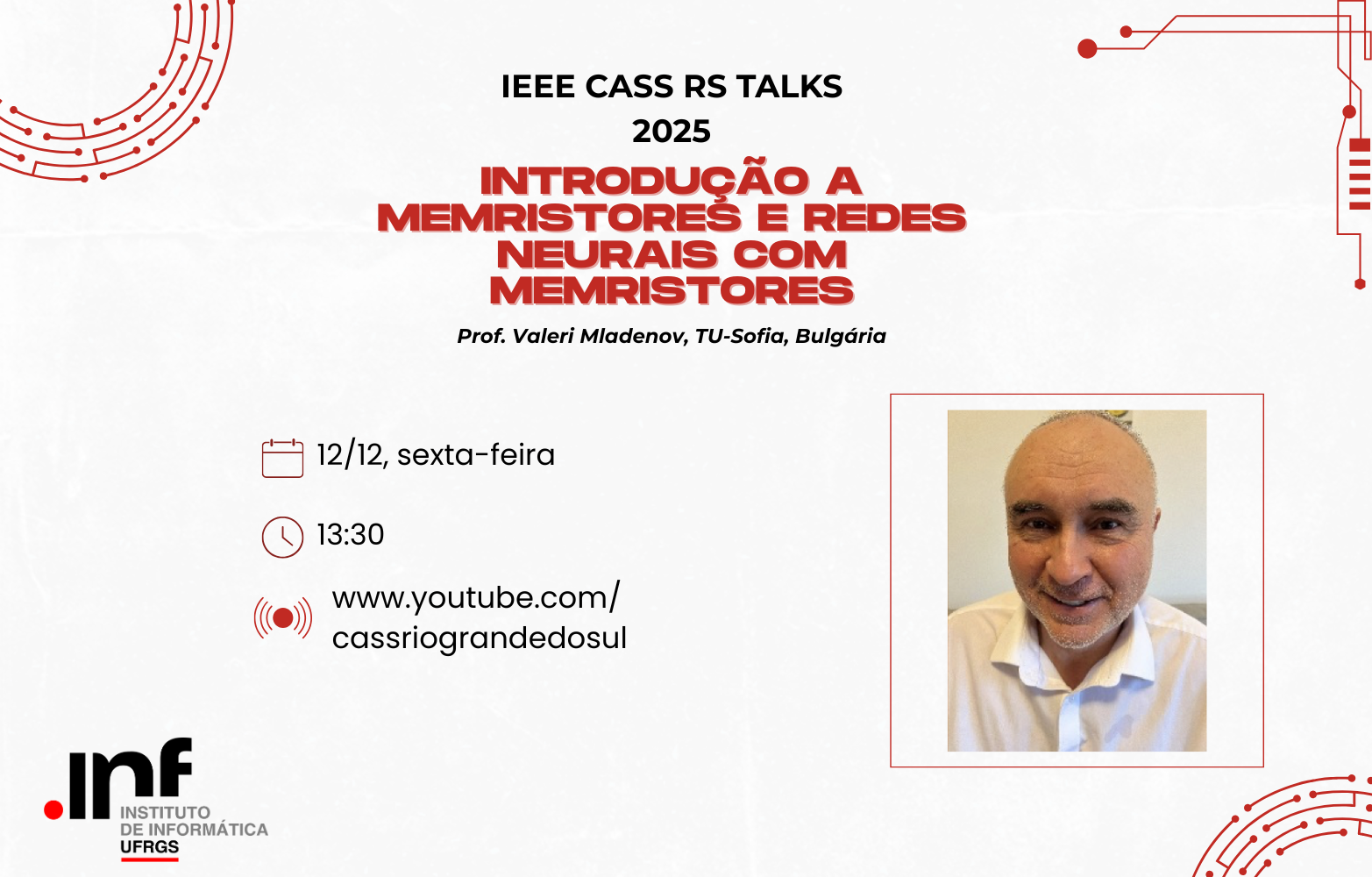 A UFRGS sediará, no dia 12 de dezembro de 2025, às 13h30 (horário de Brasília), mais uma edição do IEEE CASS RS Talks, transmitida pelo canal www.youtube.com/cassriograndedosul. O evento contará com a participação do Prof. Valeri Mladenov, da TU-Sofia (Bulgária), que apresentará a palestra “Introdução a Memristores e Redes Neurais com Memristores”.