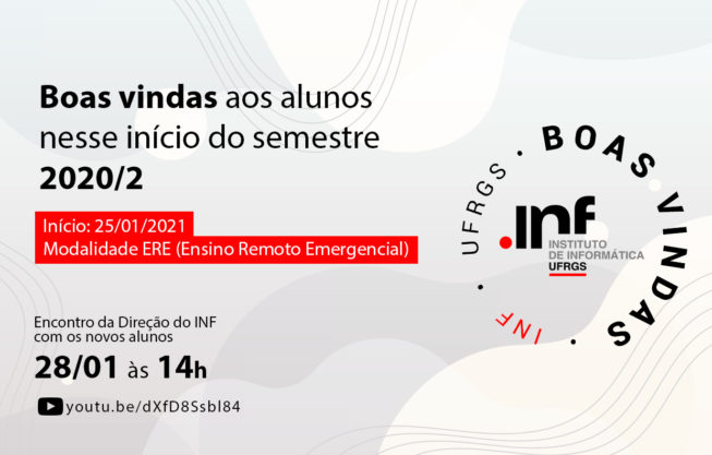 No dia 28 de janeiro, 5a. feira, às 14h, ocorre o encontro da Direção do INF com os novos alunos. Esse encontro será realizado através do MConf e transmitido pelo canal do INF no YouTube.