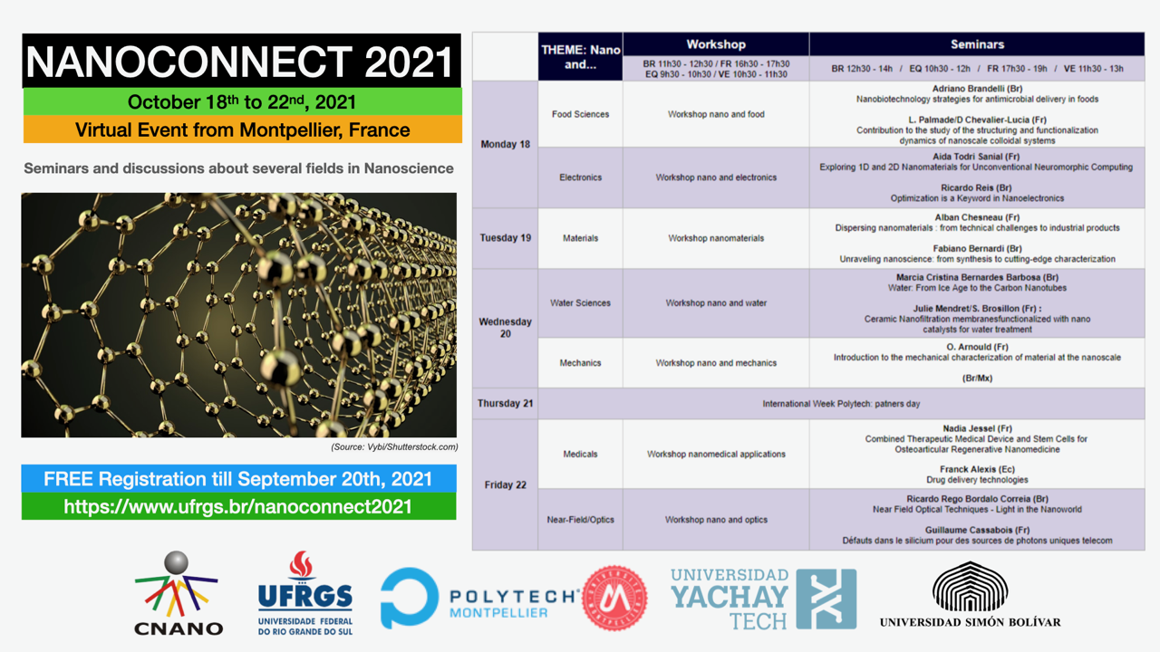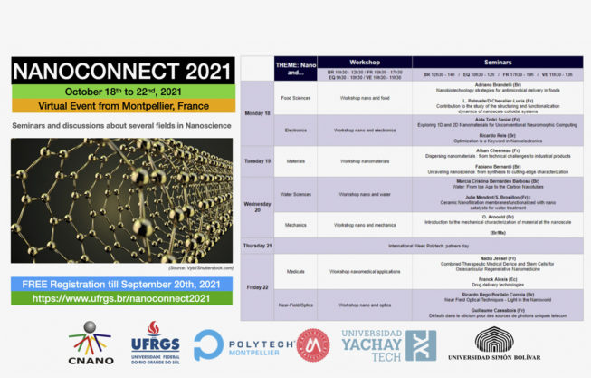 Nos dias 18 a 22 de outubro ocorrerá a Nanoconnect Visio-School 2021, promovida pela Escola Politécnica Universitária de Montpellier em parceria com o CNANO/UFRGS, de forma on-line.