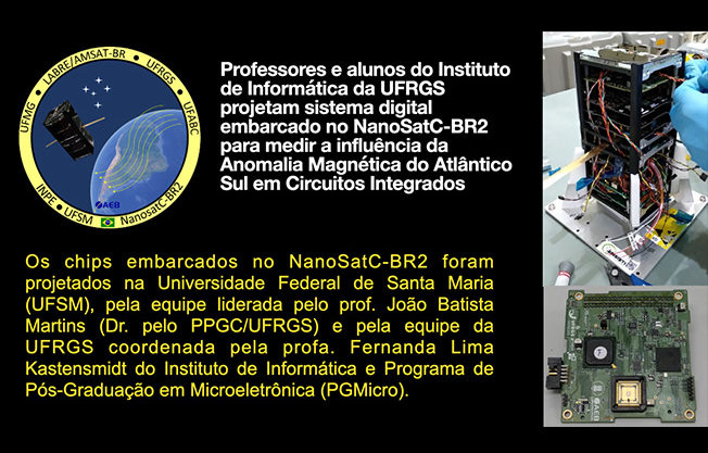 O NANOSATC-BR2 é nanosatélite científico e tecnológico no padrão CubeSat 2U com 1,72 Kg de massa que tem como objetivo estudar e monitorar, em tempo real, os distúrbios observados na Magnetosfera Terrestre, a intensidade do Campo Geomagnético e a precipitação de partículas energéticas sobre o Território Brasileiro, com determinação de seus efeitos principalmente na grande região da Anomalia Magnética do Atlântico Sul (AMAS). O projeto do nanosatélite é coordenado pelo INPE (São Jose dos Campos e Santa Maria) e a Universidade Federal de Santa Maria (UFSM) e contou com a participação de diversas universidades no Brasil para o desenvolvimento da carga útil, como a equipe da Profa. Fernanda Lima Kastensmidt do Instituto de Informática e Programa de Pós-Graduação em Microeletrônica (PGMICRO) da Universidade Federal do Rio Grande do Sul (UFRGS).