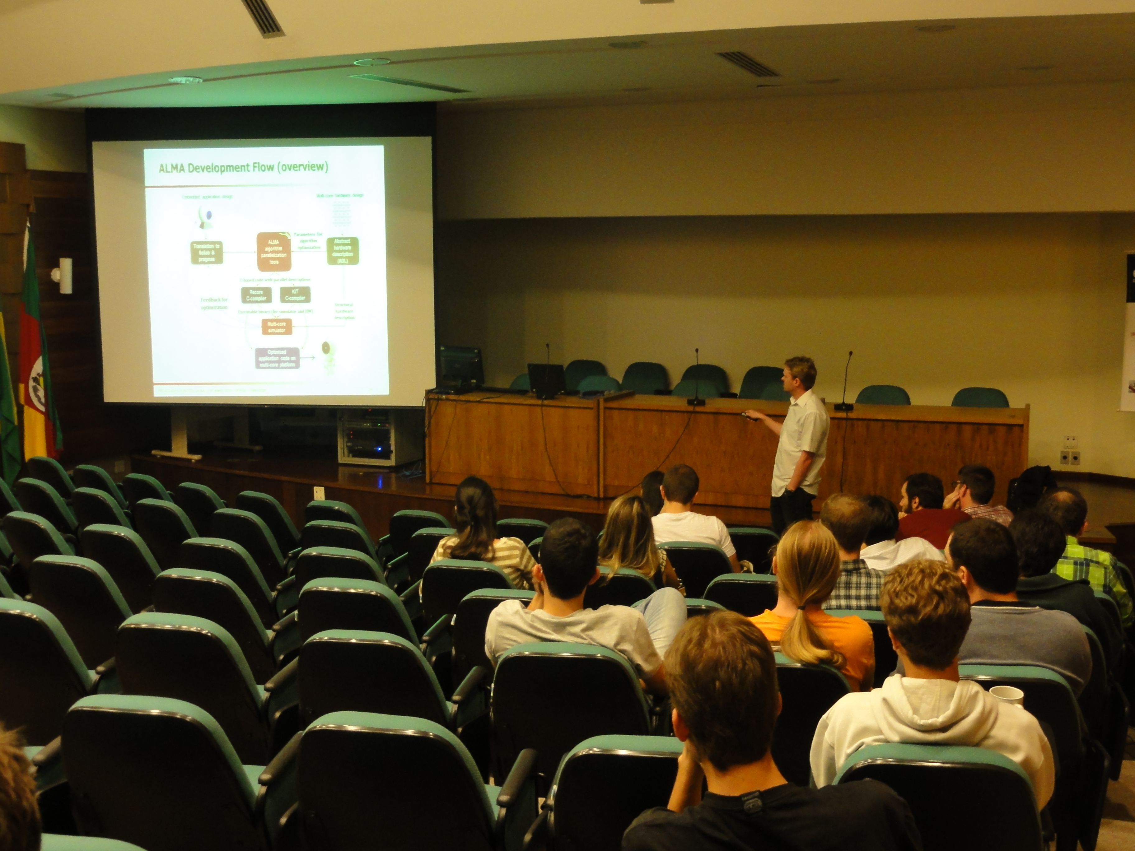 | 9. Apresentações do Grupo de Sistemas Embarcados de KIT – Germany no INF No dia 18 de março, dois trabalhos de pesquisa do grupo de sistemas embarcados do Instituto KIT na Alemanha foram apresentados no INF, a convite da professora Fernanda Lima Kastensmidt. O primeiro foi apresentado pelo Dr. Gabriel Marchesan Almeida, “FlexTiles – Self adaptive heterogeneous manycore based on Flexible Tiles” e o segundo pelo Dr. Timo Stripf, “From Scilab To High Performance Embedded Multicore Systems – The ALMA Approach”. O evento aconteceu no Auditório do Prédio 67.