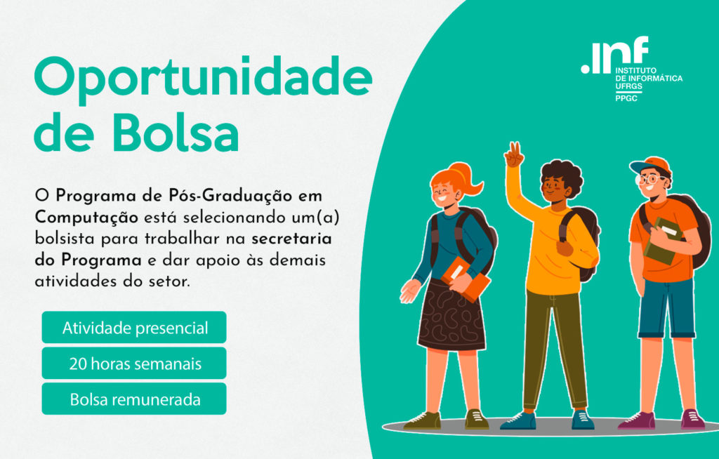 O Programa de Pós-Graduação em Computação está selecionando um(a) bolsista para trabalhar na secretaria do Programa e dar apoio às demais atividades do setor. A carga de trabalho semanal é de 20 horas presenciais no Instituto de Informática (Campus do Vale) e o valor mensal da bolsa é R$ 700,00 (horário a combinar).