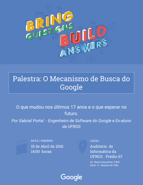 No dia 15 de abril, sexta-feira, Gabriel Portal, Engenheiro de Software do Google e ex-aluno do INF-UFRGS, ministrará a palestra “O Mecanismo de Busca do Google”, quando abordará o que mudou nos últimos 17 anos e o que esperar no futuro. O evento acontecerá às 14h no Auditório do Prédio 43413 (67).