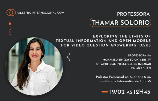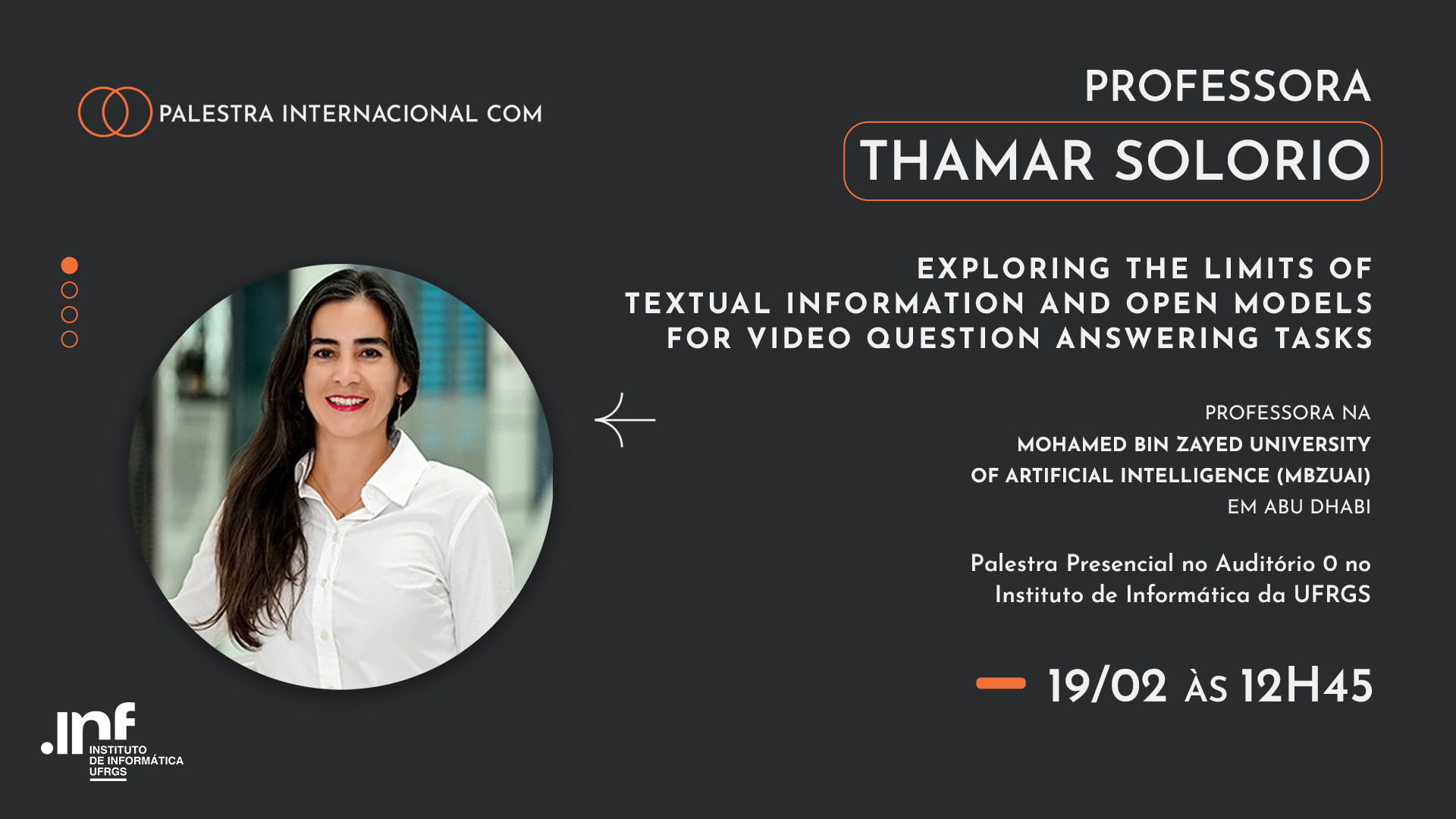 A Profª Thamar Solorio, da Mohamed bin Zayed University of Artificial Intelligence (MBZUAI) em Abu Dhabi, estará visitando o INF-UFRGS no dia 19/02 (segunda-feira). Ela irá apresentar uma palestra sobre Visual Question Answering. Além disso, uma representante da universidade irá discutir oportunidades de intercâmbio para alunos de graduação e pós nas áreas de aprendizado de máquina, processamento de linguagem natural, visão computacional e robótica. Os alunos selecionados ganham bolsa de estudos, passagens e outros benefícios.