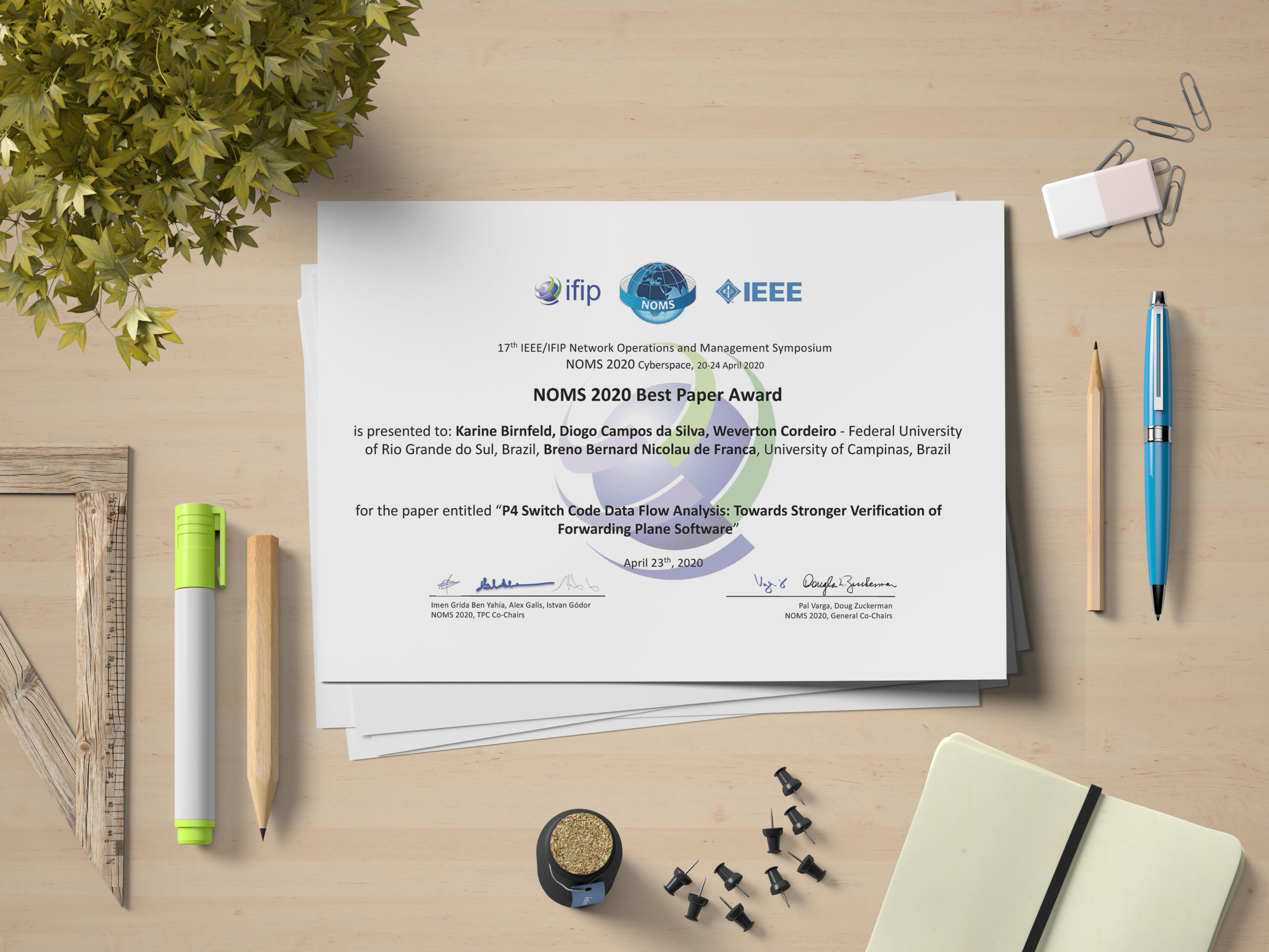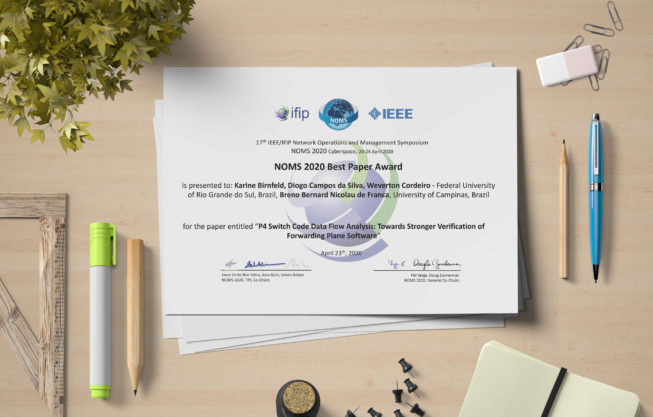 Abril foi um mês de muitas conquistas para a comunidade acadêmica de computação do Brasil. Na semana passada, o trabalho intitulado “P4 Switch Code Data Flow Analysis: Towards Stronger Verification of Forwarding Plane Software”, dos estudantes Karine Birnfeld (PPGC/UFRGS) e Diogo Campos da Silva (INF/UFRGS), supervisionado pelo Professor Adjunto do INF, Weverton Cordeiro e pelo Professor do Instituto de Computação da UNICAMP, Breno de França, recebeu o Prêmio Best Paper no 17th IEEE/IFIP Network Operations and Management Symposium (NOMS 2020). O simpósio foi realizado entre os dias 20 a 24 de abril, no formato de uma conferência virtual, devido à pandemia do COVID-19.