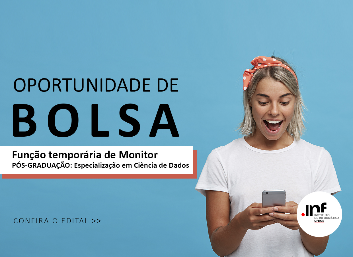 O Instituto de Informática da UFRGS torna pública a abertura de inscrições para o processo seletivo simplificado para a função temporária de Monitor, categoria PÓS-GRADUAÇÃO, para atuação no Curso de Especialização em Ciência de Dados, sob execução no Departamento de Informática Aplicada. Estão abertas 04 (quatro) vagas para atuação na equipe de apoio ao Curso de Especialização, sendo um requisito básico para se candidatar às vagas ser aluno regular devidamente matriculado no Programa de Pós-Graduação em Computação da UFRGS.
