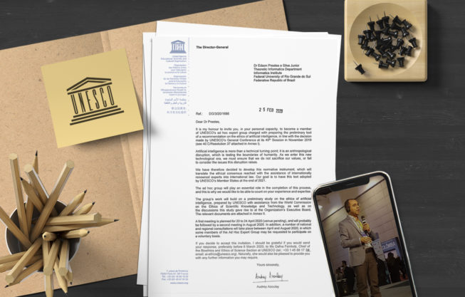No dia 25 de fevereiro, o Professor Associado do Instituto de Informática da UFRGS, Edson Prestes, recebeu o convite da Diretora Geral da Organização das Nações Unidas para a Educação, a Ciência e a Cultura (UNESCO), Audrey Azoulay, a integrar o Ad Hoc Expert Group on Ethics and AI. Este grupo dará suporte a elaboração um instrumento normativo internacional que irá converter o consenso sobre Ética e Inteligência Artificial em uma lei internacional. O objetivo final é que esta lei seja adotada pelos Estados Membros da UNESCO até o final de 2021.