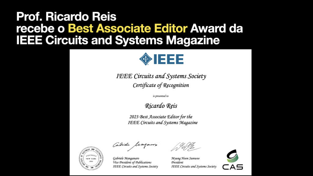 Professor do Instituto de Informática, Ricardo Augusto da Luz Reis, recebeu o 2023 Best Associate Editor Award da IEEE Circuits and System Magazine, magazine principal da IEEE CASS, publicado 4 vezes ao ano e com fator de impacto de 6,9. Sendo reconhecido por seu excelente serviço aos periódicos CASS por meio de sua meticulosidade, pontualidade e dedicação para garantir que seus periódicos mantenham e melhorem sua qualidade técnica.[1]