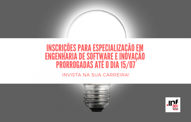 As inscrições para o curso de especialização em Engenharia de Software e Inovação no INF foram prorrogadas até o dia 15/07, você já conhece? Inicia em agosto de 2019 e são oferecidas até 60 vagas. A seleção será realizada através da análise da documentação dos candidatos.
