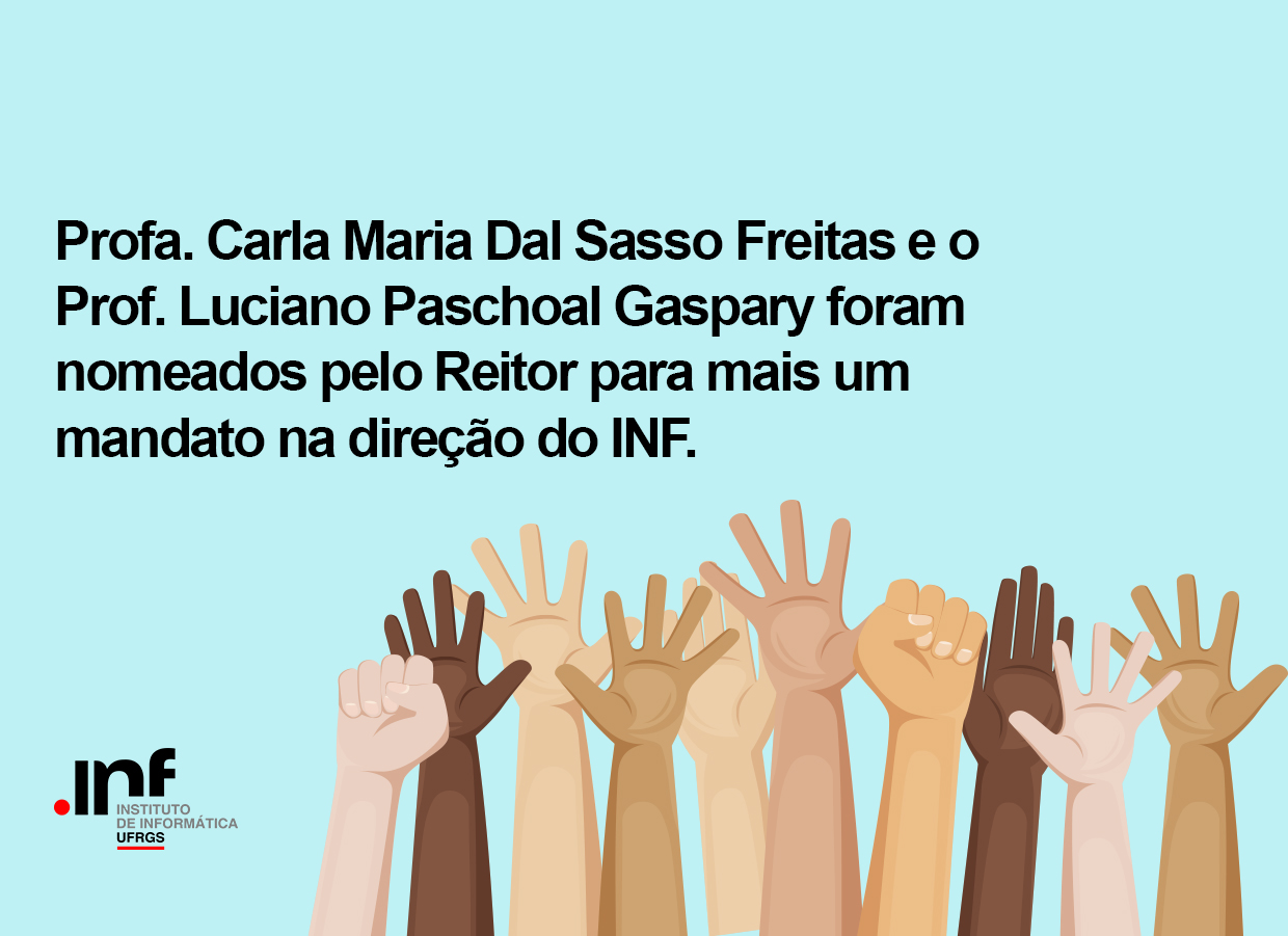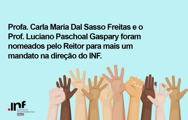 No dia 25/11, o Reitor da UFRGS, Prof. Carlos André Bulhões Mendes, assinou as portarias de nomeação da Profa. Carla Maria Dal Sasso Freitas, para o cargo de Diretora do INF e do Prof. Luciano Paschoal Gaspary, para o cargo de Vice-Diretor, com vigência a partir de 20/12/2020 até 19/12/2024. As portarias foram publicadas no Diário Oficial da União na mesma data.