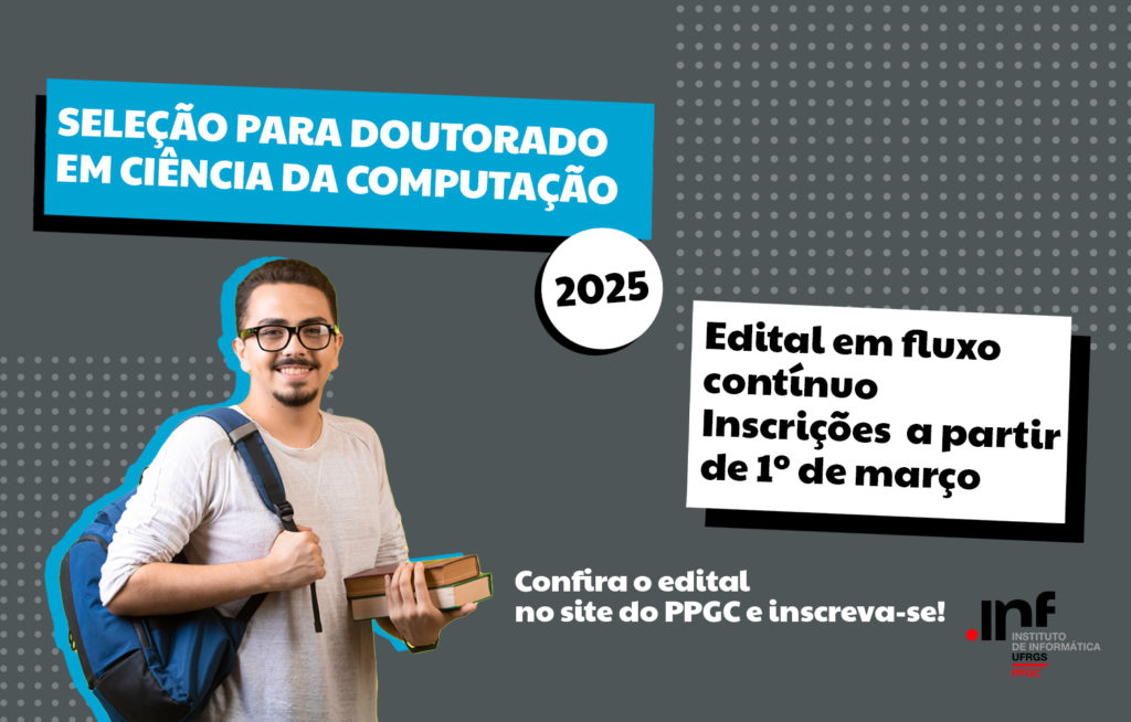 O Programa de Pós-Graduação em Ciência da Computação (PPGC) da UFRGS anuncia a abertura do processo seletivo para ingresso no curso de doutorado em fluxo contínuo. As inscrições estarão abertas de 1º de março a 11 de agosto de 2025, com possibilidade de ingresso entre abril e novembro do mesmo ano.