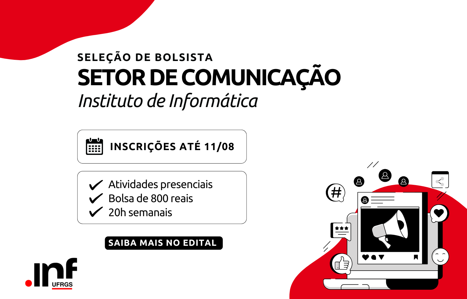 O Setor de Comunicação do Instituto de Informática (INF), em conjunto ao Centro de Empreendimentos em Informática (CEI) da UFRGS, está com inscrições abertas para 1 vaga de Bolsista de Marketing e Divulgação.