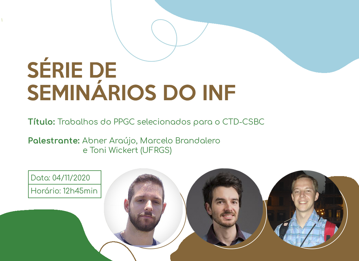 Trabalhos do PPGC selecionados para o CTD-CSBC é o título da próxima palestra da Série de Seminários do Instituto de Informática da UFRGS. A conferência será ministrada pelo Ms. Abner Araújo, Dr. Marcelo Brandalero e o Dr. Toni Wickert.