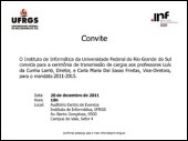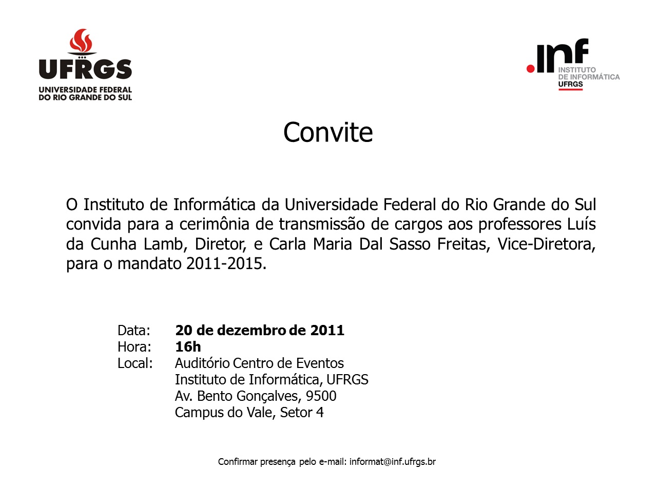 A cerimônia de transmissão de cargos aos professores Luís da Cunha Lamb, Diretor, e Carla Maria Dal Sasso Freitas, Vice-Diretora, para o mandato 2011-2015, acontecerá no dia 20 de dezembro, às 16h, no Auditório no Auditório do Centro de Eventos do Instituto.
