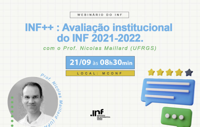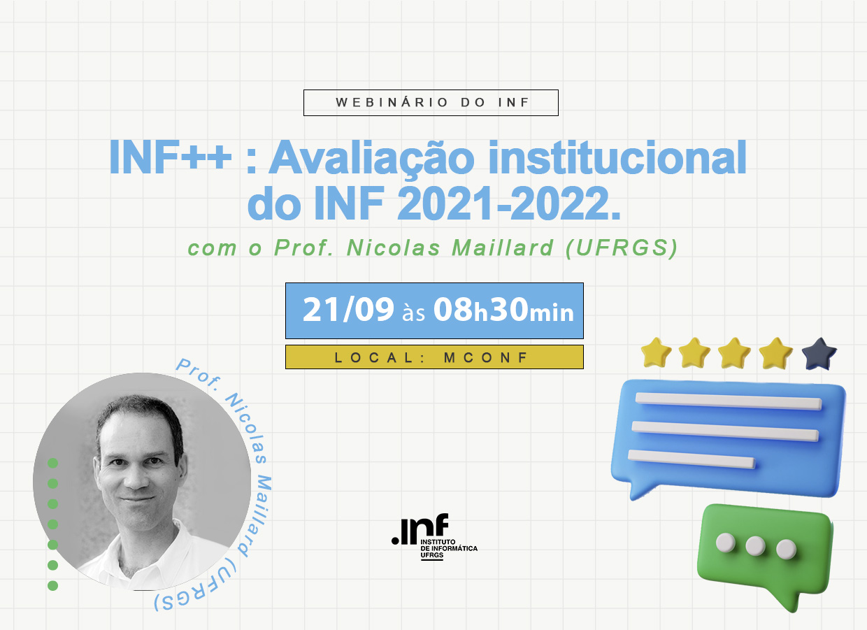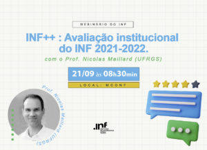 INF++ : Avaliação institucional do INF 2021-2022 será o tema do Webinário do INF, apresentado pelo Professor Nicolas Maillard (atual coordenador do NAU). Na ocasião, que ocorrerá no dia 21/09 às 08h30min, será apresentada a avaliação institucional anual do Instituto de Informática da UFRGS.