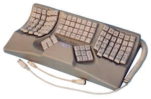 Recentemente a Microsoft propôs um teclado dito ergonômico, conhecido como teclado natural Microsoft, mostrado na figura abaixo.